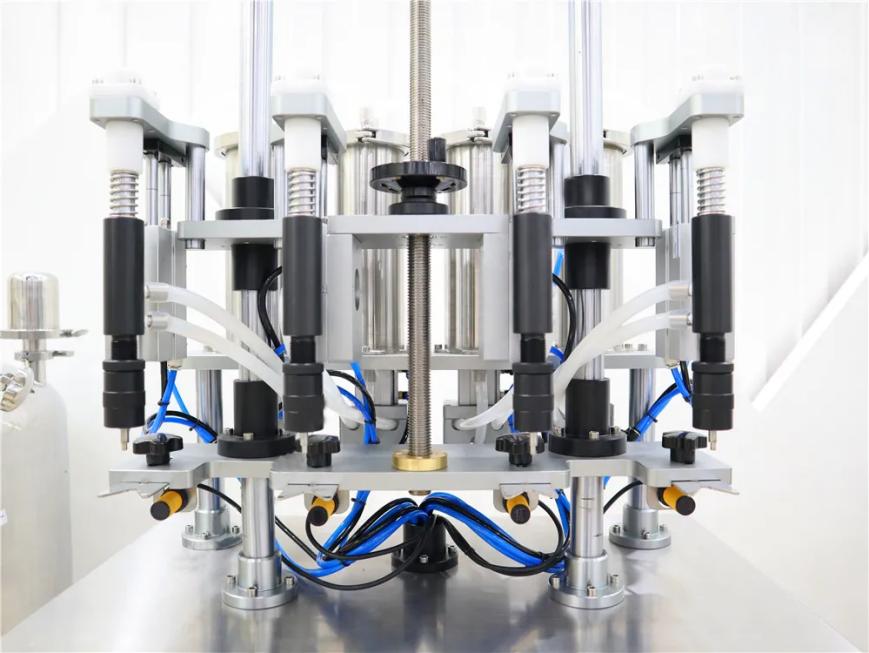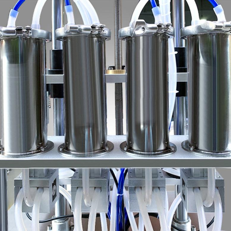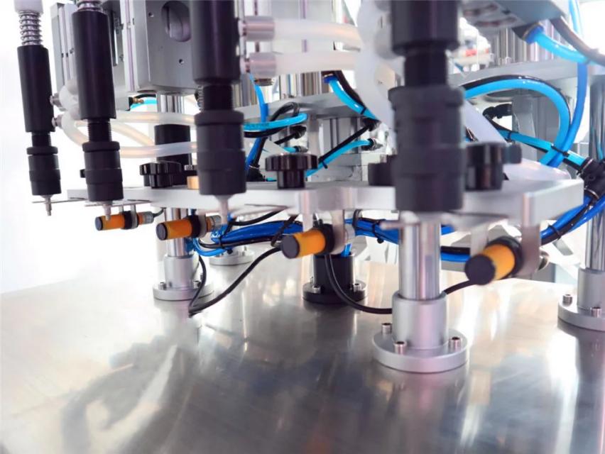 Equipped with high quality electric eye,each nozzle can be controlled to fill liquid when the electric eye receives and sends out signal to the system.The white bottle fixing component can help to fix bottles when the machine start to work,prevent the bottle from falling down.
