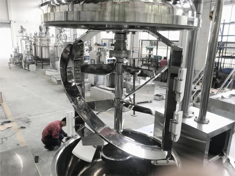 2. The vacuum emulsifying mixer with a helical ribbon mixing and double-way mixing system is designed to ensure even mixing and emulsification of ingredients. The helical ribbon mixing system consists of a helical ribbon agitator that rotates inside the mixing vessel. This agitator has a helical shape, which helps to efficiently move and mix the ingredients. As the helical ribbon rotates, it creates a gentle kneading and folding action, ensuring thorough blending of the ingredients. The double-way mixing system, on the other hand, involves the use of two mixing directions. This system utilizes multiple mixing blades that move in opposite directions, further enhancing the mixing efficiency. The dual mixing action helps to create a more uniform dispersion of ingredients and ensures that all components are evenly distributed throughout the mixture.